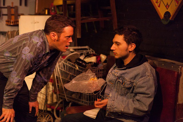 Located in the basement of an old school building, Acme Theatre just may be the perfect venue to recreate Don Dubrow’s basement-level junk shop where all the action of American Buffalo takes place. The euphemistically named “Don’s Resale” is an organized clutter of reclaimed items. Lamps, stereos, trophies, bird cages, hats, typewriters, globes and discards of every description cram the shelves of three walls. Parked in one corner is a supermarket shopping cart overflowing with footwear. In the center of the stage is a glass case that holds jewelry, coins and other such valuables.