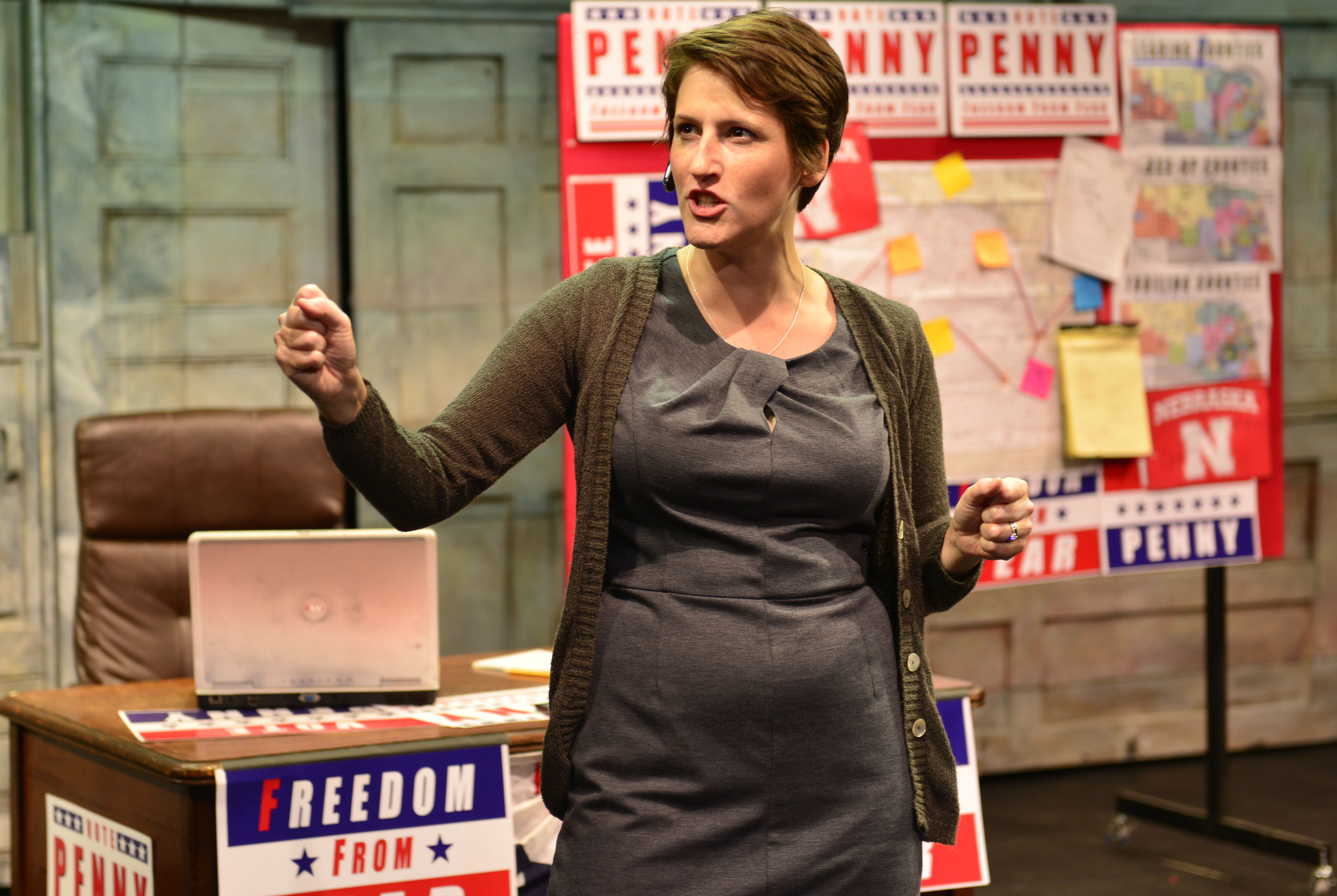To the playwright’s and director’s credit, they mostly keep things non-ideological. Penny’s “Palinesque” aura notwithstanding, her pronouncements are neither liberal nor conservative, but merely idiotic.